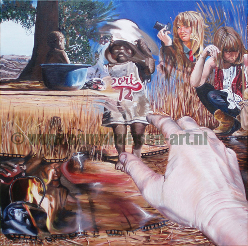 En als eerste ontstond het schilderij 'Ga'. Toen het af was besloot ik dat ik het niet zondermeer kon verkopen en besloot dat 50% van de opbrengst moet gaan naar dergelijke weeskinderen. Bijdragen en opbrengsten zijn overgemaakt naar www.youngheroes.org.sz/ Na het schilderij 'Ga' volgden het jongetje Macabo, dat zijn dagelijkse wasbeurt geheel zelfstandig uitvoert. Geen badeentjes en waterpret, maar een serieuze aangelegenheid. Zich reinigen voor de dag. En één voor één ontstonden de ideeën voor de volgenden in de serie.